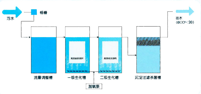 污水經(jīng)細(xì)目格柵粗過(guò)濾后重力流入流量調(diào)節(jié)槽,經(jīng)潛污泵進(jìn)入生化槽1、生化槽2進(jìn)行生化處理,通過(guò)生化槽內(nèi)懸掛的微孔吸附石不斷向板狀填料釋放****生物菌群,生化槽內(nèi)設(shè)有****曝氣系統(tǒng),為高活性好氧微生物菌群提供充足的氧氣,從而****降解污水中的有機(jī)污染。經(jīng)生化槽2處理后的污水流入沉淀過(guò)濾****槽,污水在該槽進(jìn)行沉淀,下層沉淀的污泥由回送裝置返回流量調(diào)節(jié)槽重新消化處理,上層的清液經(jīng)微孔陶粒過(guò)濾****裝置過(guò)濾****后即可達(dá)到國(guó)家一級(jí)排放標(biāo)準(zhǔn)。