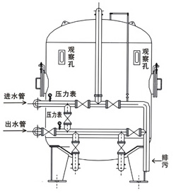 石英砂過濾器:(過濾砂缸)以石英砂為濾料,濾除水中的懸浮物,機械雜質,有機物、泥砂等,從而降低水的濁度。